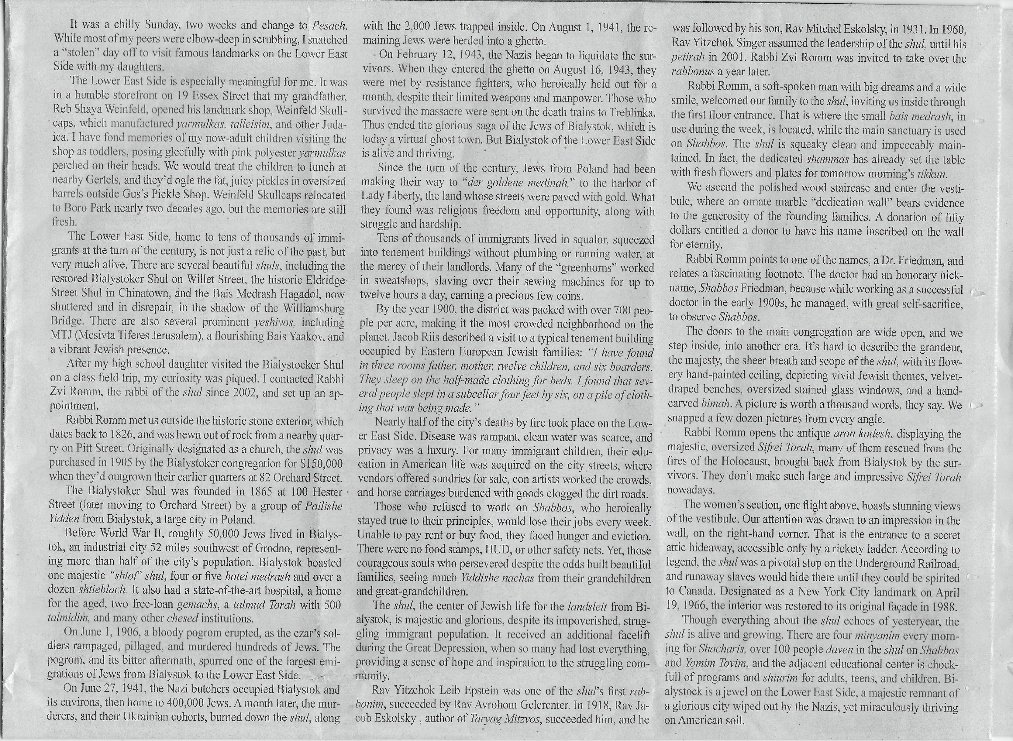10002. The New Lower East Side by Hilary Larson. The Jewish Week. The Bialystoker Shul: Singles Events in a Magnificent, Historical Setting by Rivkie Lichstein. Jewish Voice and Opinion. Forbes Magazine lists the Lower East Side as the fourth best neighborhood in the nation in which to buy real estate. Forbes. Vayachanu vayisau by Reuven Gafni. (Hebrew article about the Lower East Side and the Bialystoker Synagogue). Makor Rishon. 125 Years of Prayer by Helen Zelon. Grand Street News. Sukkot Across America at Seward Park by Pat Arnow. LOHO Blog. Young Bialystoker rabbi teaches tolerance and passion by Marvin Greisman. The Villager. It's Not Dynamic, It's Bialystok by Jonathan Mark. The Jewish Week. Synagogue Launches Kindergarten Program by Mordechai Leib. Grand Street News. Jewish Life Downtown by Yitzchok A. Dawidowicz. The Jewish Week. Bialystoker Celebrates 125th Anniversary, Installs Rabbi, Honors Speaker by Jack E. Dell. Grand Street News. Mazal Tov by Richard McBee. High Holiday Beginners Services Offered Through The National Jewish Outreach Program. Local Orthodox Leader Preaching Moderation and Cooperation by Yori Yanover. Grand Street News.