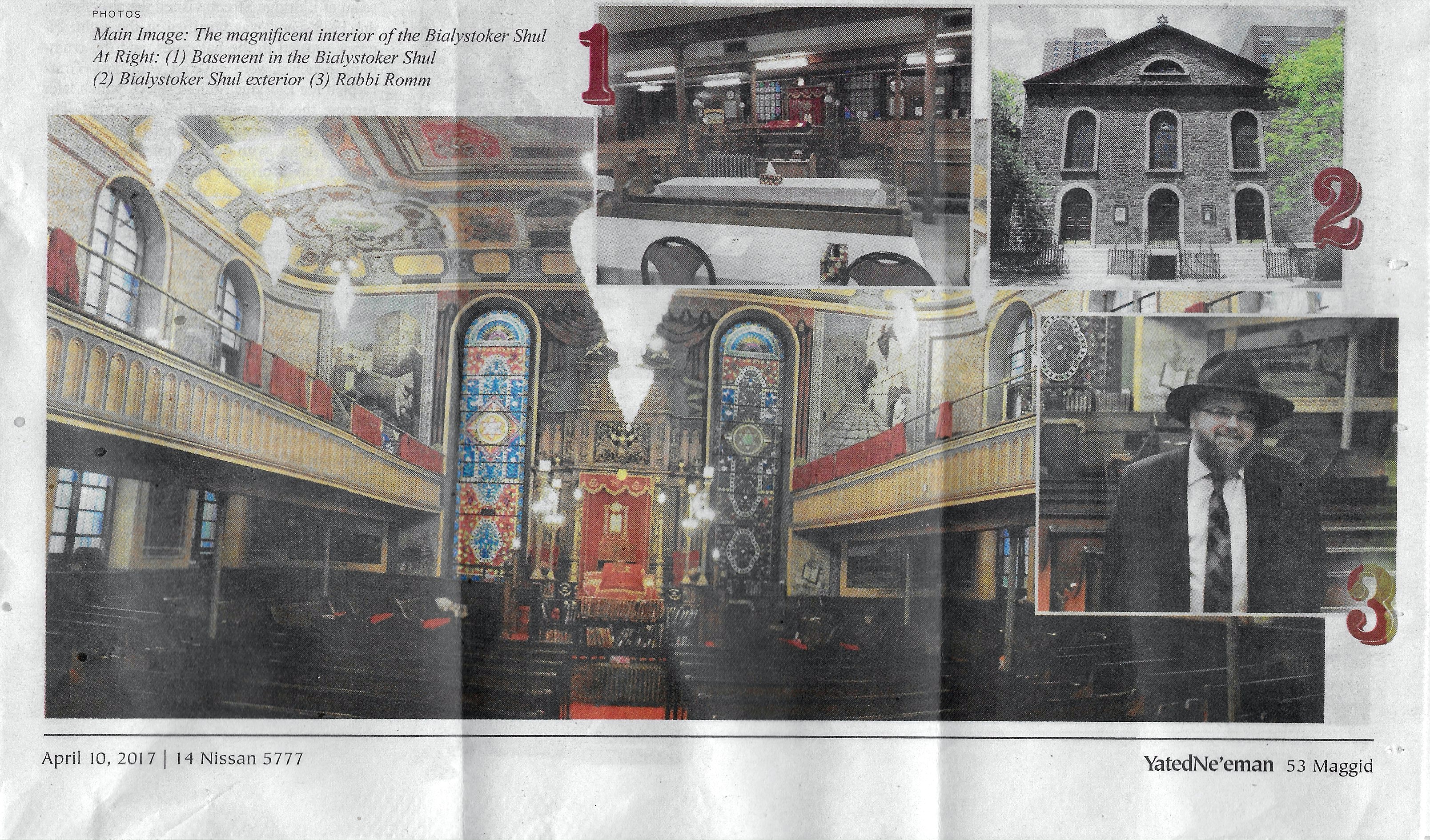 In The NewsRead about The Bialystoker Synagogue in these publications:Everyman’s Gadol”: An Appreciation of Rav Dovid Feinstein zt”l by Rabbi Romm November 19, 2020 LehrhausRabbi Romm's hesped for Rav Dovid Feinstein z"tl, Nov. 8, 2020 on YU Torah Rabbi Romm on Parshat HaShavua. HaMizrachi Rabbi Romm on BDS Supporter Speaking at Henry Street Settlement. May 11, 2017. The Jewish Press The Majesty and Mystery of the Lower East Side. April 10, 2017. Yated Ne'eman article and pictures. Rabbi Romm discusses the history of the synagogue. JewishGen Podcast Memorial Plaques and other Items from Bialystoker Home Preserved at Bialystoker Synagogue. The LoDown, April 4, 2017 In Conversation with Rabbi Zvi Romm. HaModia Inyan Magazine, January 13, 2016 Rabbi Mordechai Greenberg, Rosh Yeshiva of Yeshivat Kerem B'Yavneh, gave a shiur on June 10, 2013 at the shul. Rabbi and Rebbetzin Romm were honored at a dinner at the Museum of Jewish Heritage on the occasion of the 60th anniversary of the yeshiva. Generating Merit for our Forebears. HaModia Magazine, October 10, 2012. Spotlight on Communities: The Lower East Side. HaModia Inyan Magazine, July 30, 2012. Laying the Foundation. HaModia Shul Supplement. pp.28-29. The Synagogue that Doesn’t Just Pray for Your Health by T. Kilgore. Grand Street News. 3 New York Area Shuls Chosen As Grant Recipients for New OU Outreach Program. OU News. The Relentless Teacher by Yori Yanover. Grand Street News. Sukkot
